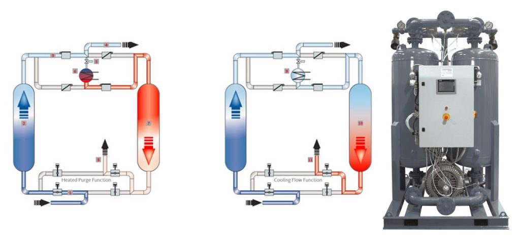 برای احیاء هرچه سریعتر مواد جاذب رطوبت در این نوع از درایر ها از یک عدد هیتر و فن خارجی یا بلوئر استفاده می شود. در درایر جذبی هیتردار همانند درایر جذبی بدون هیتر برج شماره 1 کار جداسازی رطوبت آب موجود در هوای فشرده را انجام می دهد و برج شماره 2 به وسیله فن و هیتر یا بلوئر مورد دمش قرار می گیرد و افزایش دما پیدا می کند و رطوبت در این برج از مواد جاذب جدا شده و توسط تزریق قسمتی از هوای خشک تولید شده در خط purge، رطوبت به طور کامل از سیستم خارج می گردد و این روند به همین شکل برای برج 1 انجام می پذیرد. مقدار purge air دراین مدل 1 تا 2 درصد از هوای وارد شده به درایر می باشد و عموما برای ظرفیت های بالاتر از 30000 لیتر بر دقیقه استفاده می شود. از آنجایی که از هیتر و فن در این درایر استفاده می شود هزینه اولیه و هزینه نگهداری بیشتری نسبت به مدل های دیگر دارد.